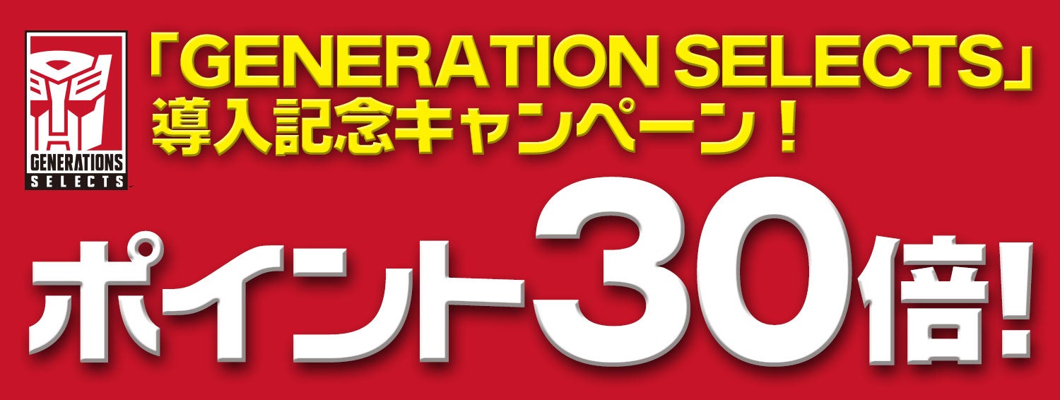 タカラトミーモール専用新シリーズ「GENERATION SELECTS」の予約スタートを記念して、新シリーズ導入記念“ポイント30倍キャンペーン”を実施します!この機会に是非、「GENERATION SELECTS」を予約して下さい。 ※このポイント30倍キャンペーンは、「GENERATION SELECTS」のみ対象となります。 ※キャンペーンは予告無く、終了する場合があります。