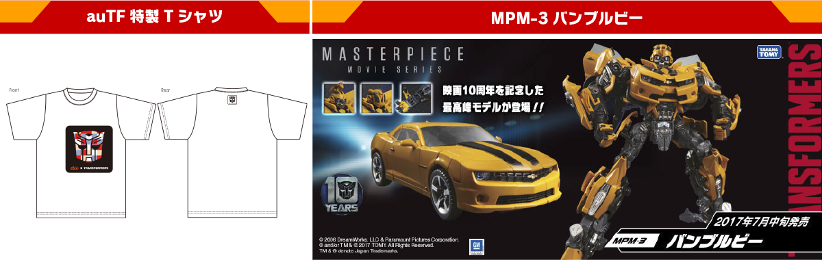 最優秀賞品(1名):auTF特製Tシャツ(Mサイズ)とトランスフォーマー玩具(MPM-3バンブルビー) 優秀賞品(4名):auTF特製Tシャツ(Mサイズ)