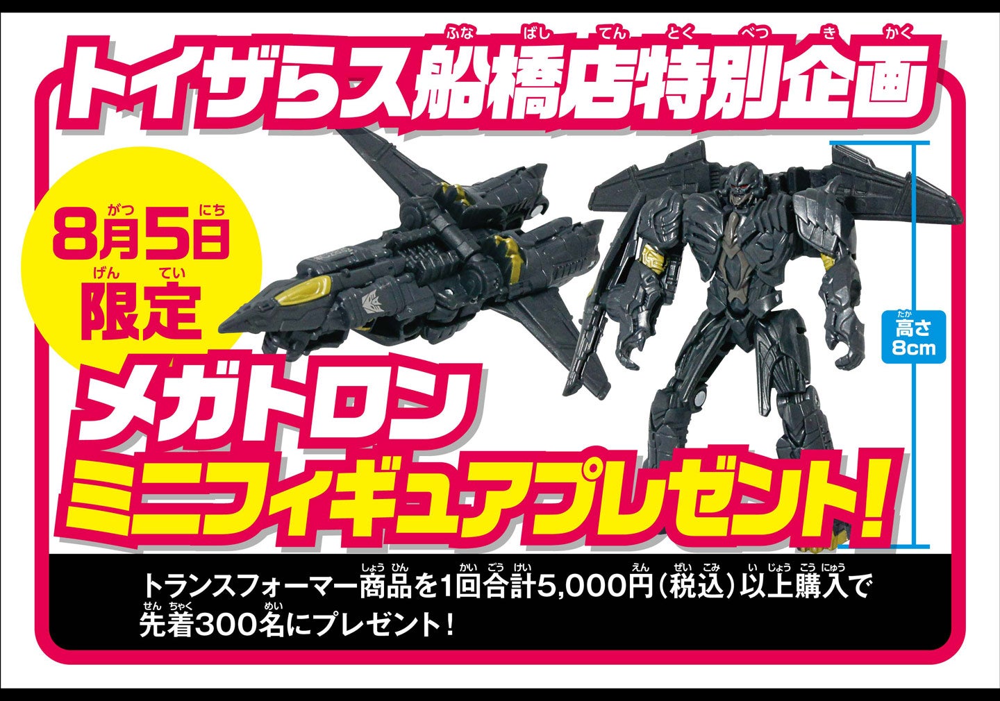 「TRANSFORMERS FES 2017」の開催に合わせて、「三井ショッピングパーク ららぽーとTOKYO-BAY」内の「トイザらス・ベビーザらス 船橋店」では、8月5日(土)限定で、トランスフォーマー商品を1回合計5,000円(税込)以上ご購入いただいた先着300名様に、日本未発売のメガトロンのフィギュアをプレゼントいたします。